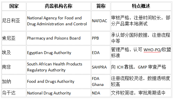 正遭到越来越多中国制药企业的注沉。凭仗复杂的生齿基数、日益增加的医疗需求以及对健康系统的投资加大,非洲成为药品出口的新蓝海。目前,非洲生齿已超14亿,医药市场规模于2023年已冲破600亿美元(数据来历IQVIA《Africa’s Pharmaceutical Market Outlook 2023》)。做为非洲次要药品进口来历国之一,中国药品正在部门国度进口占比跨越30%(数据来历:WHO Africa药品供应链调研)。但取此同时,非洲国度正在药品进口方面存正在律例分歧一、流程复杂、政策不竭变化等挑和。全球跨境医贸平台滴度医贸网为您系统梳理药品出口非洲的焦点流程取实操要点,帮帮企业少走弯、非洲54个国度,每个国度的药监体系体例和准入尺度差别大。以下为部门沉点国度药监机构(NRA)简介: